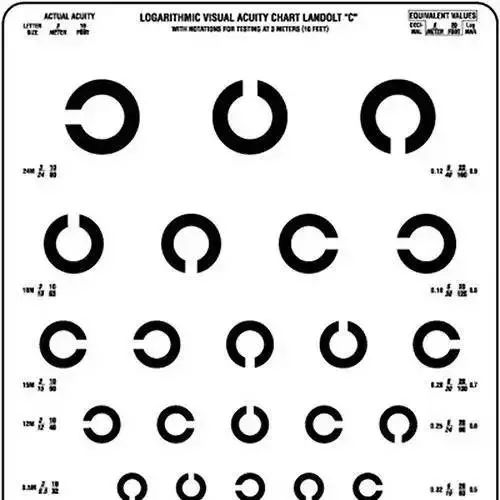 標(biāo)準(zhǔn)對(duì)數(shù)遠(yuǎn)視力表我們平時(shí)所說的測(cè)視力其實(shí)是檢測(cè)眼睛看遠(yuǎn)處的能力(遠(yuǎn)視力表),其準(zhǔn)確定義為:測(cè)定能夠認(rèn)識(shí)其形狀的最小視網(wǎng)膜上的成像。視力表有很多種形式,最常見的是E字型視力表。用E字母是為了讓不認(rèn)識(shí)英文字母的人,也可以看懂E字三橫線缺口的方向。我們常用的E字國(guó)際標(biāo)準(zhǔn)視力表是根據(jù)視角的原理設(shè)計(jì)的。所謂的視角就是由外界兩點(diǎn)發(fā)出的光線,經(jīng)眼內(nèi)結(jié)點(diǎn)所形成的夾角。在5米距離,10行的E字上下兩橫在視網(wǎng)膜上的投影正好是1度角,計(jì)算公式為:視力=1/度角。“C”視力表(Landolt環(huán)視力表)檢查視力一般分為遠(yuǎn)視力和近視力兩類,遠(yuǎn)視力多采用國(guó)際標(biāo)準(zhǔn)視力表,此表為12行大小不同開口方向各異的“E”字所組成;測(cè)量從0.1到1.5;每行有標(biāo)號(hào),被檢者的視線要與1.0的一行平行,視力表與被檢查者的距離必須正確固定,患者距表為5米,如不足5米,應(yīng)在2.5米處放置平面鏡來反射視力表。進(jìn)行檢測(cè)時(shí)先遮蓋一眼,單眼自上而下辨認(rèn)“E”字缺口方向,知道不能辨認(rèn)為止,記錄下來即可。若被測(cè)試者0.1頁(yè)看不到時(shí),要向前移動(dòng),直到能看到0.1位置,其視力則是“0.1X距離/5=視力”;若半米內(nèi)仍看不到0.1,可令被測(cè)試者辨認(rèn)指數(shù),測(cè)手動(dòng)、光感等。